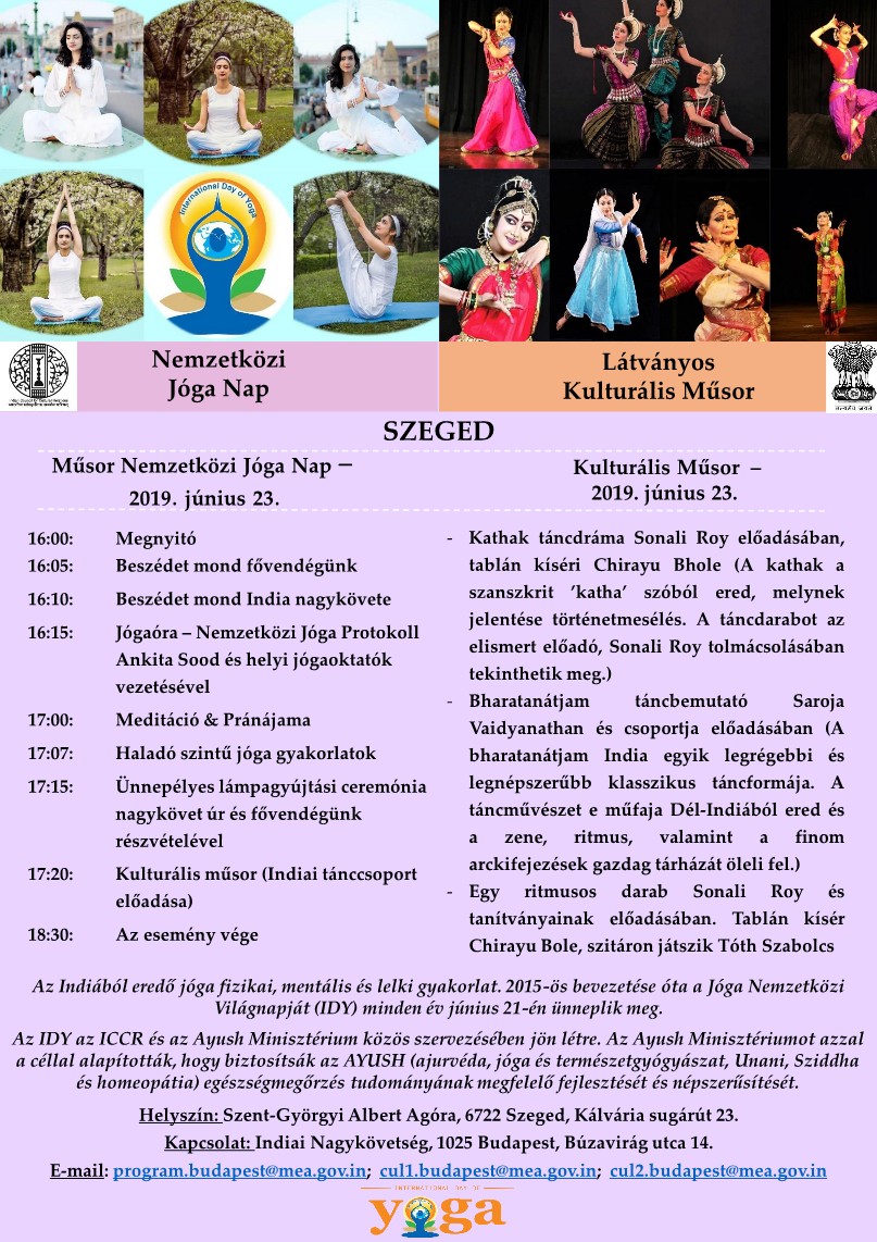Idén már ötödik alkalommal kerül megrendezésre a Jóga Nemzetközi napja. Az Indiai nagykövetség szervezésében várunk Szegedre is szeretettel 2019. június 23-án, vasárnap 16-19 óra között.