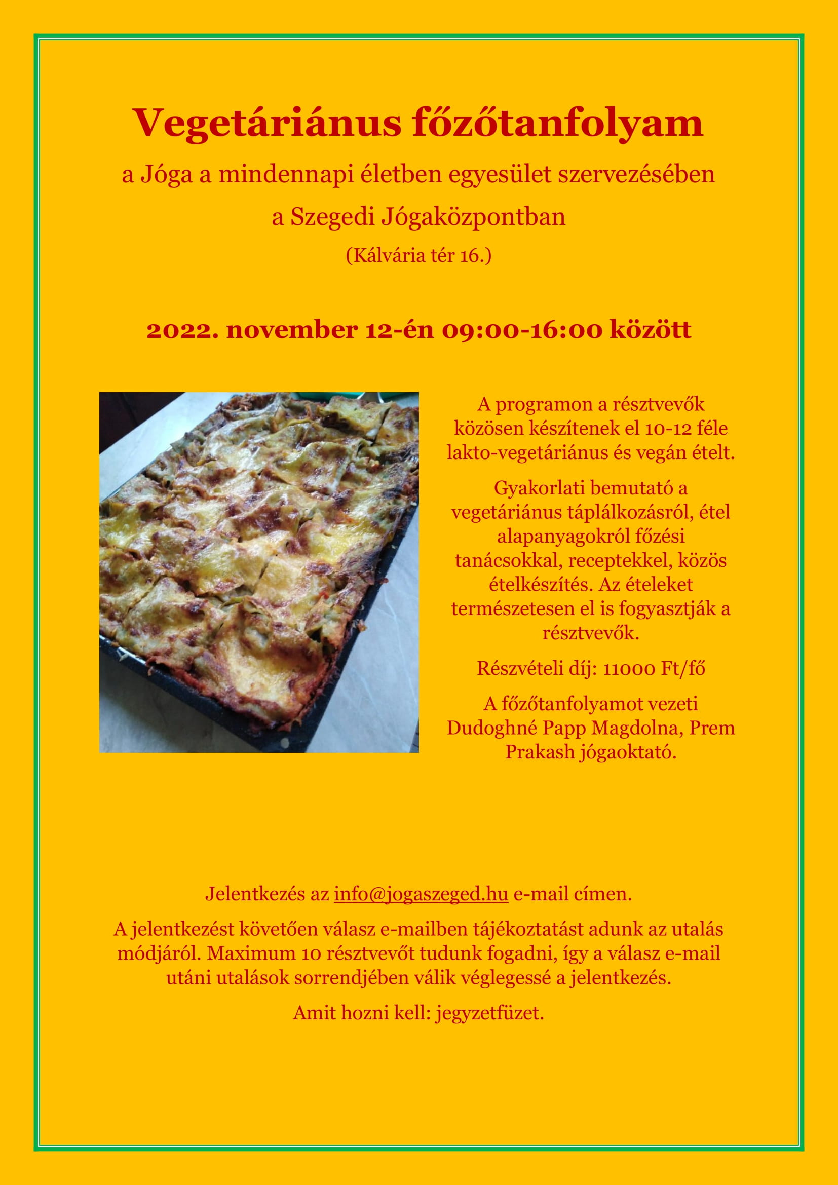 2022. október 23 Vegetáriánus főzőtanfolyam Szegeden - ÚJ IDŐPONT November 26-án vegetáriánus főzőtanfolyamot szervezünk a Szegedi Jógaközpontban. (Technikai okok miatt elmaradt az eredetileg meghirdetett november 12-i alkalom)