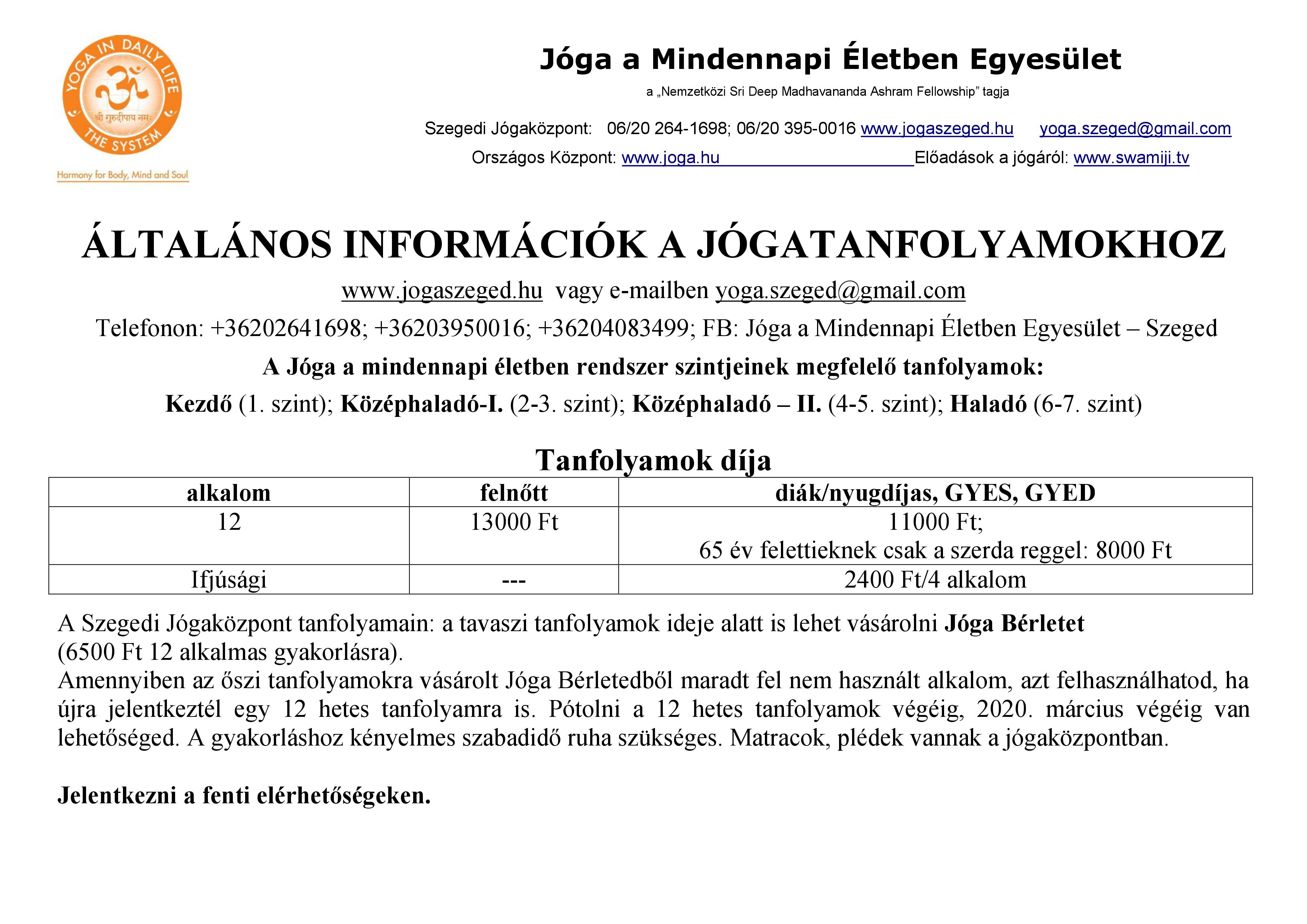 Lesznek kezdő tanfolyamok Szegeden, Makón és Kecskeméten. Várjuk szerda reggelente a Szegedi Jógaközpontba azokata 65 év felettieket, akik már gyakorolták a Jóga a mindennapi életben rendszert. Ők kedvezményes áron vehetnek részt ezen a tanfolyamon. Továbbra is lesz ifjúsági jógaóránk szombatonként.
