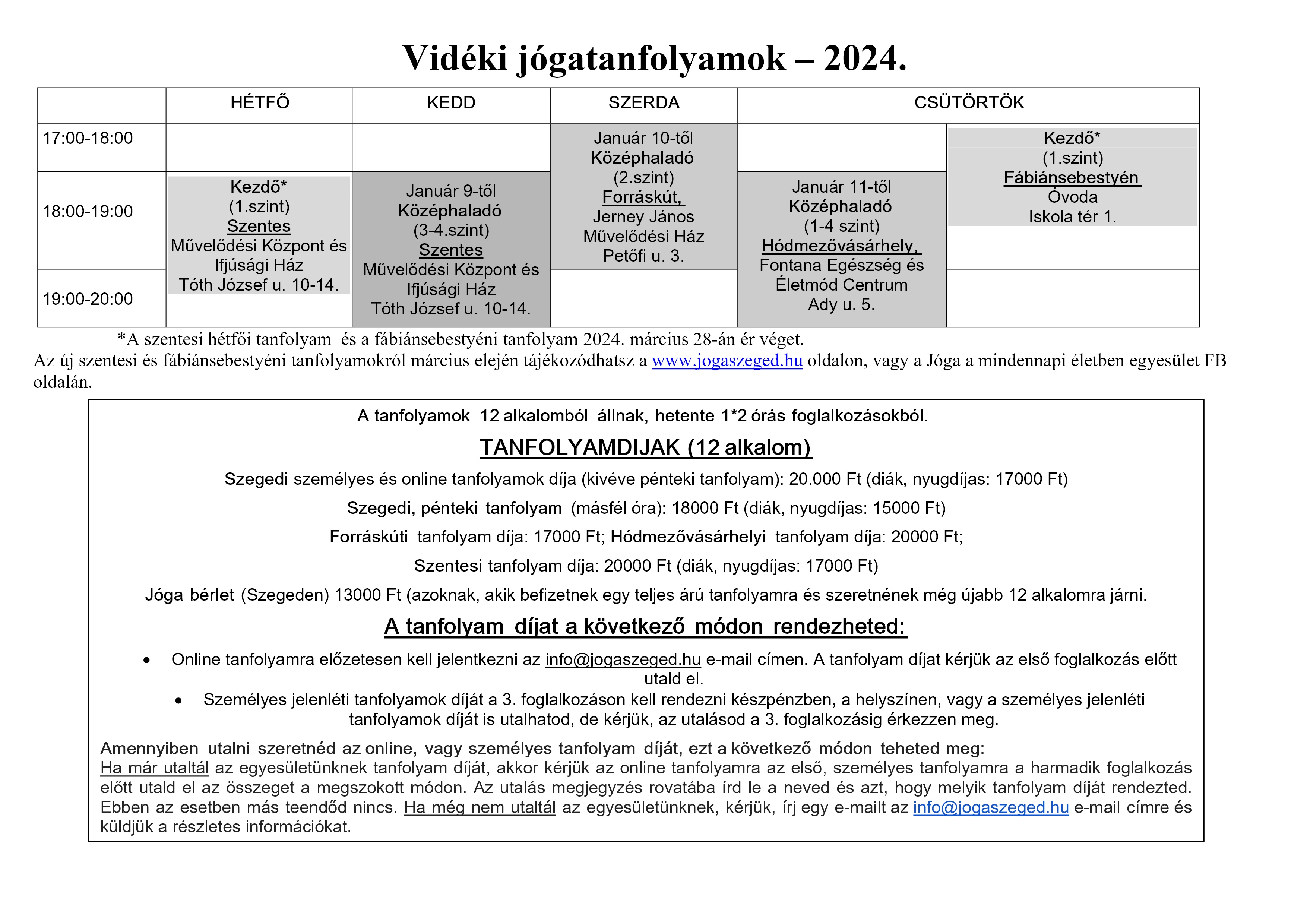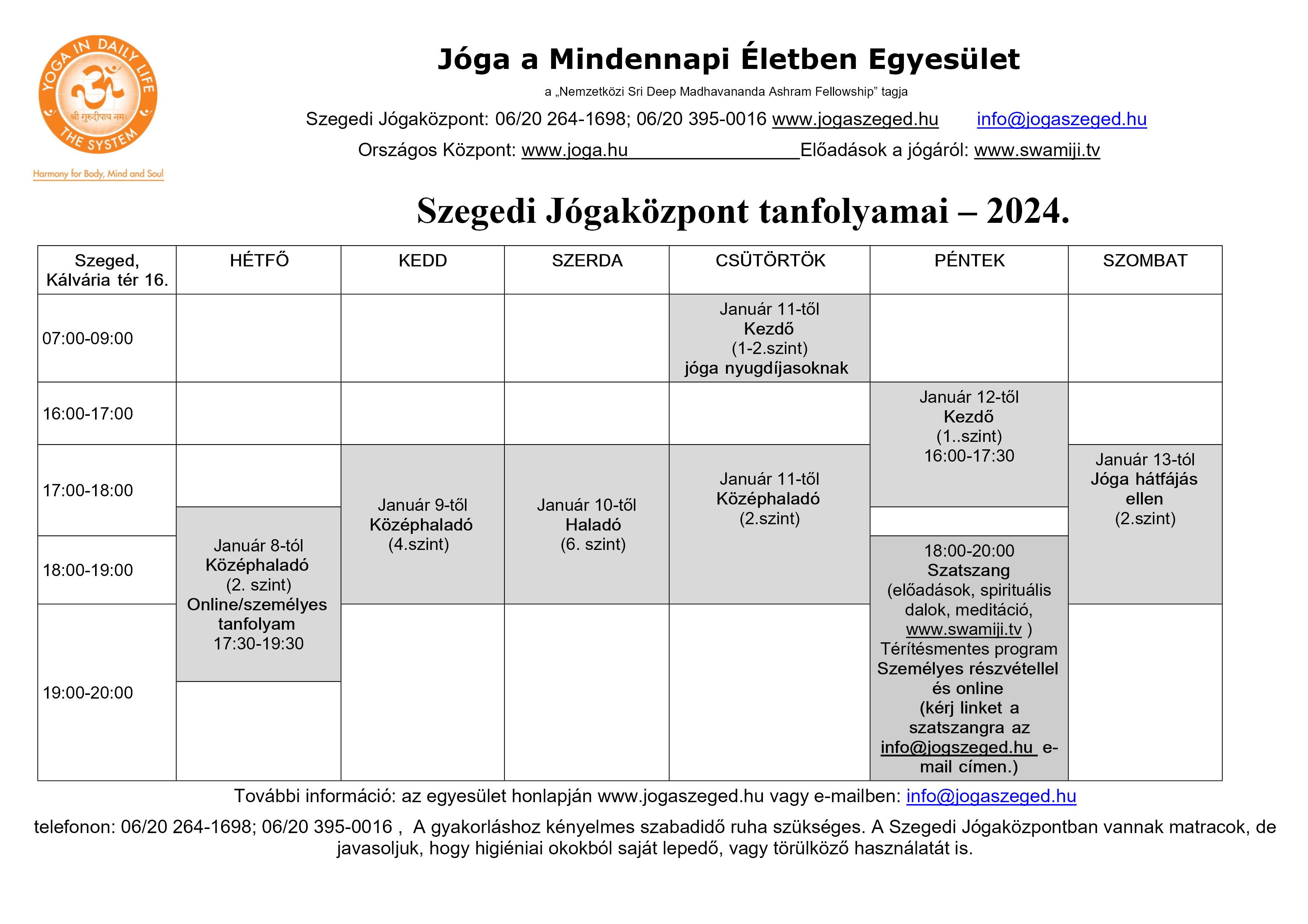 Szegeden a Szegedi Jógaközpontban (Kálvária tér 16.) lesz kezdő tanfolyam nyugdijasoknak, illetve péntekenként. Emellett haladó jógaórákon is részt vehetsz.
