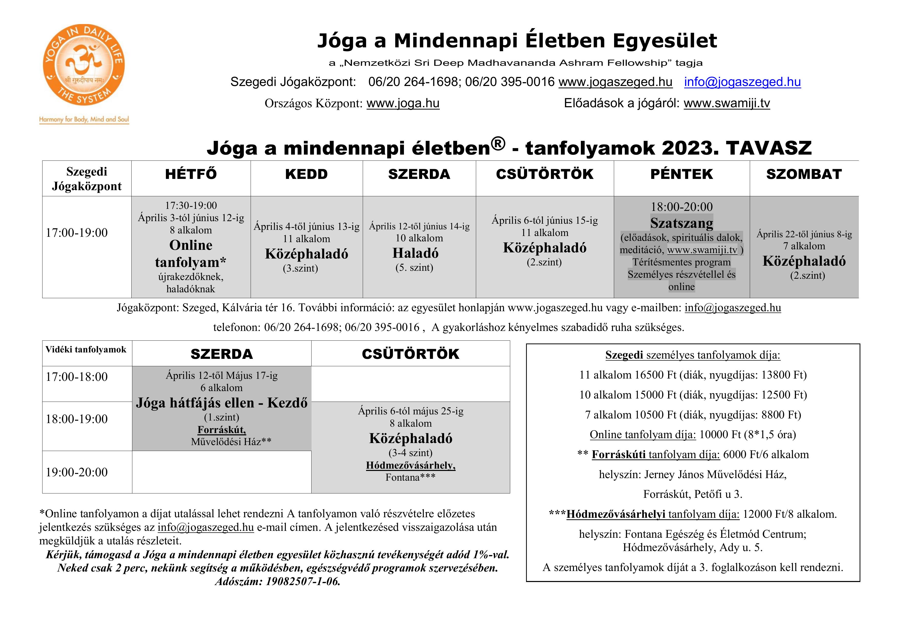Örömmel értesítünk, hogy elkészült a Jóga a mindennapi életben egyesület tavaszi órarendje.