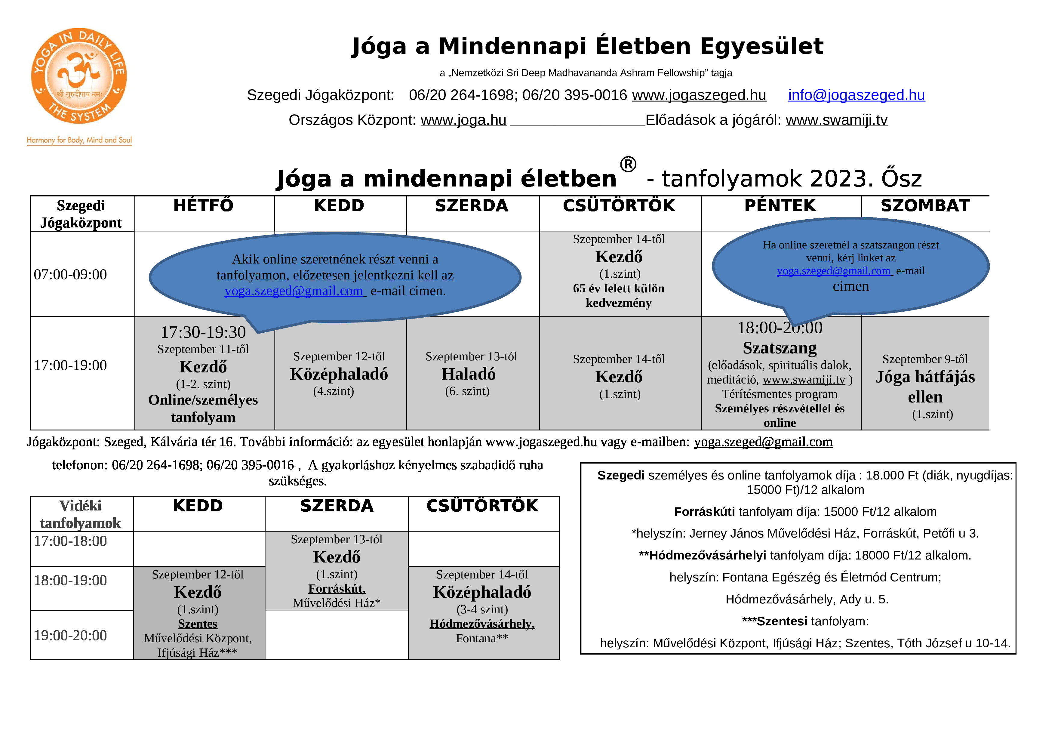 Elkészült a Jóga a mindennapi életben egyesület őszi órarendje. Válaszd ki a neked megfelelő jógatanfolyamot és várunk szeretettel jógát gyakorolni.